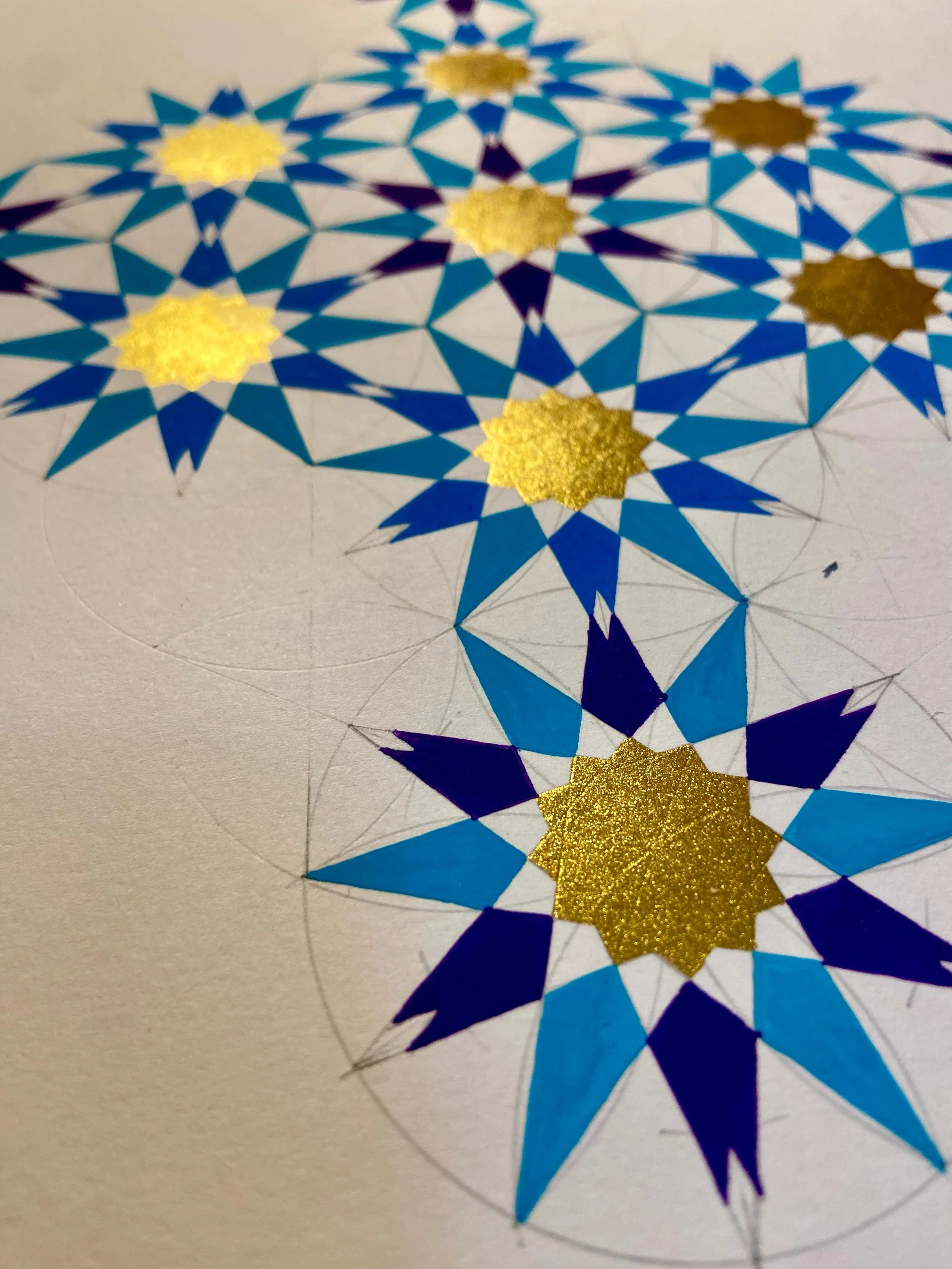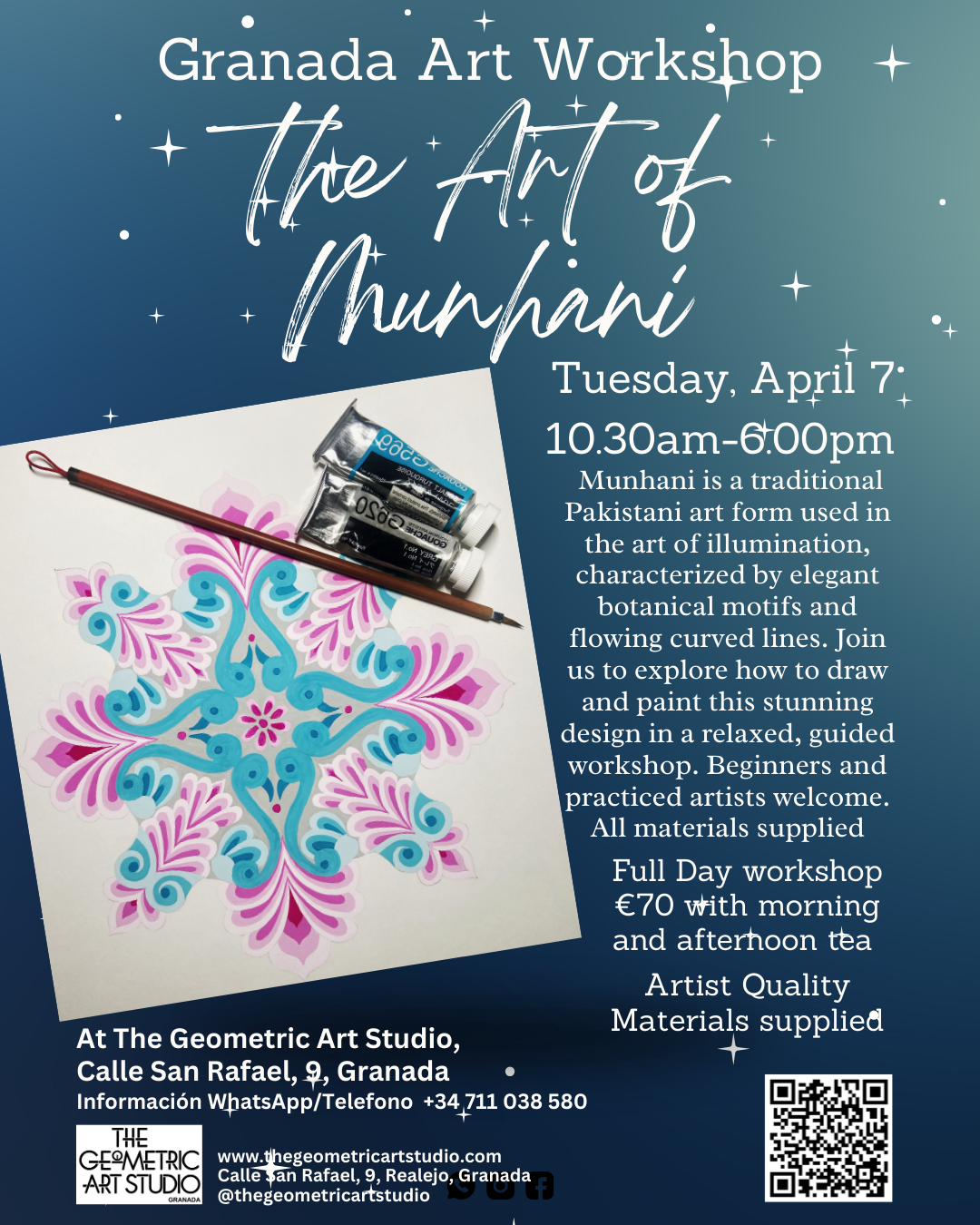 Join us for an inspiring 8-week geometric art course in the beautiful Lecrin Valley! Go beyond the beauty of the Alhambra as you explore stunning patterns from cultures around the world. Each week, you'll dive into the history, learn to draw with traditional tools (ruler & compass), and begin transforming your designs into vibrant painted artwork.