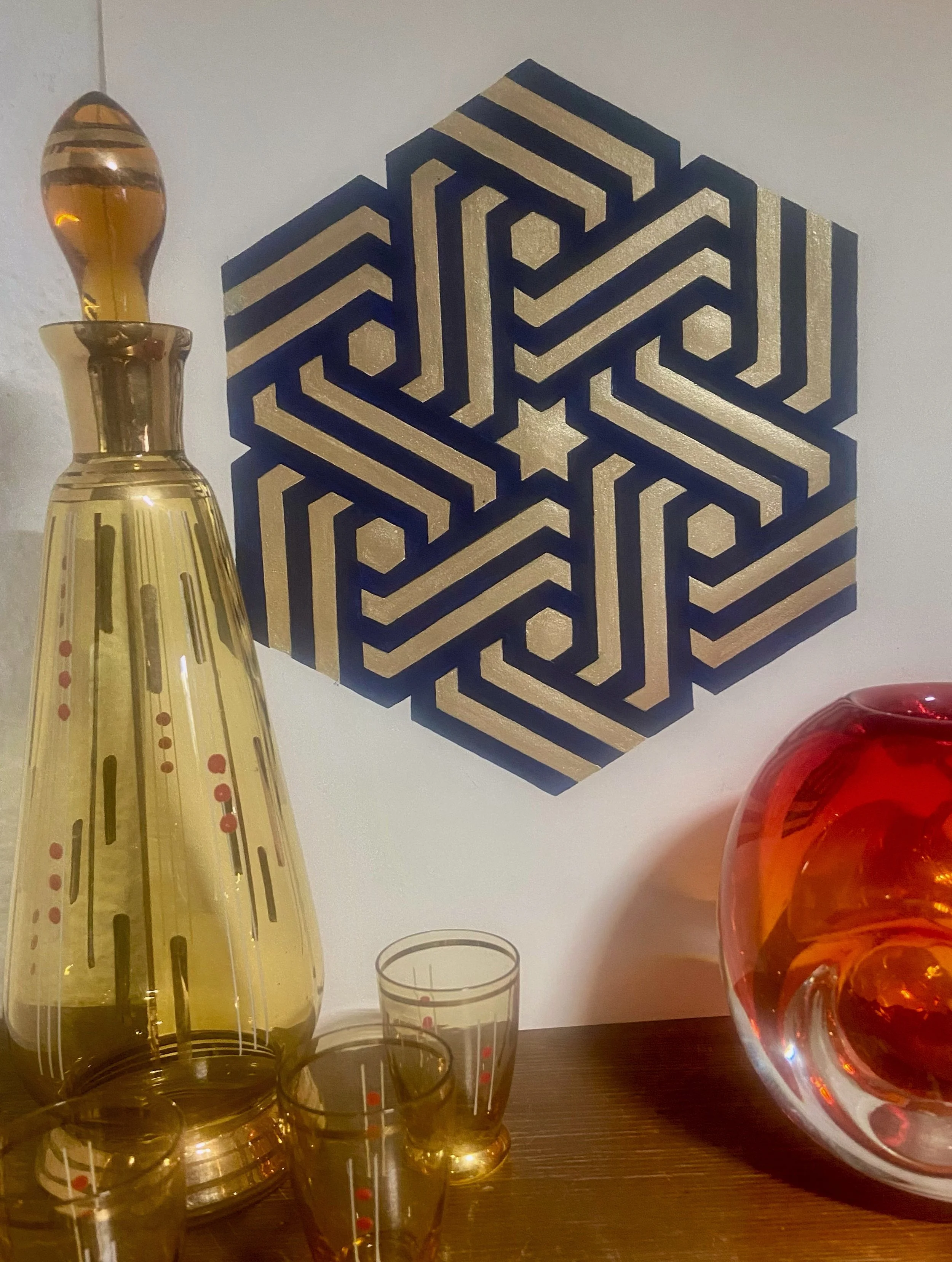 The pattern I’ll be teaching comes directly from Bukhara and if you follow my instagram you would have had a sneak preview a few weeks ago when I was talking about my favourite tools. Now I’ve finished painting this in indigos and golds — a colour pairing I can’t seem to resist — but there are endless possibilities for how you might bring your own version to life. You can see my painting above with a few of my glass treasures I collected whilst in Uzbekistan, and I won’t even mention how many gorgeous Sousanis I have carried with me to Spain!